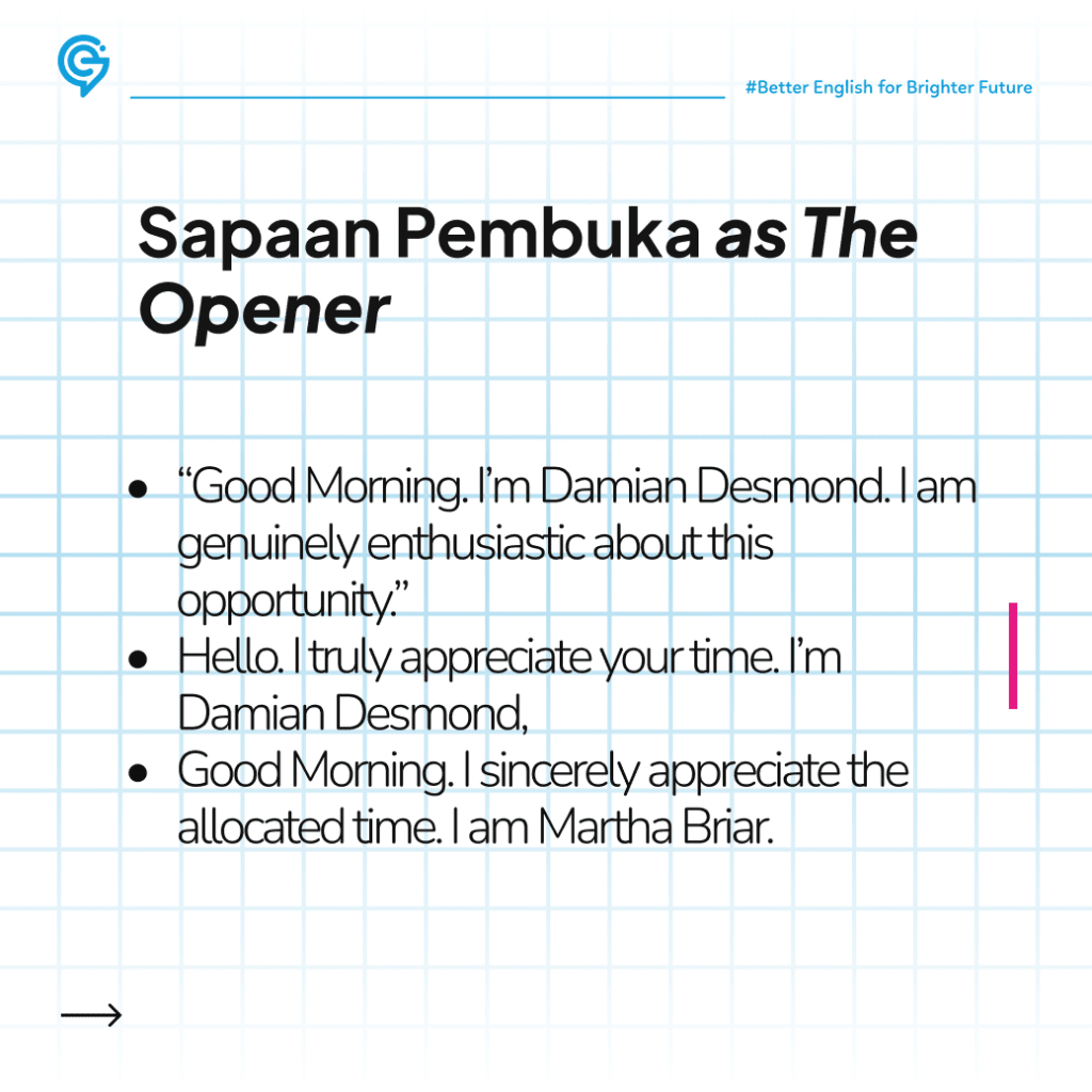 Saat sudah giliranmu untuk bicara oleh rekruiter, pakai jurus sapa dan senyum terlebih dahulu. Awali perkenalan Teman Global sebut nama dengan percaya diri dan ucap terima kasih atau antuasiasme. Misalnya “Good Morning. I’m Damian Desmond. I am genuinely enthusiastic about this opportunity.”