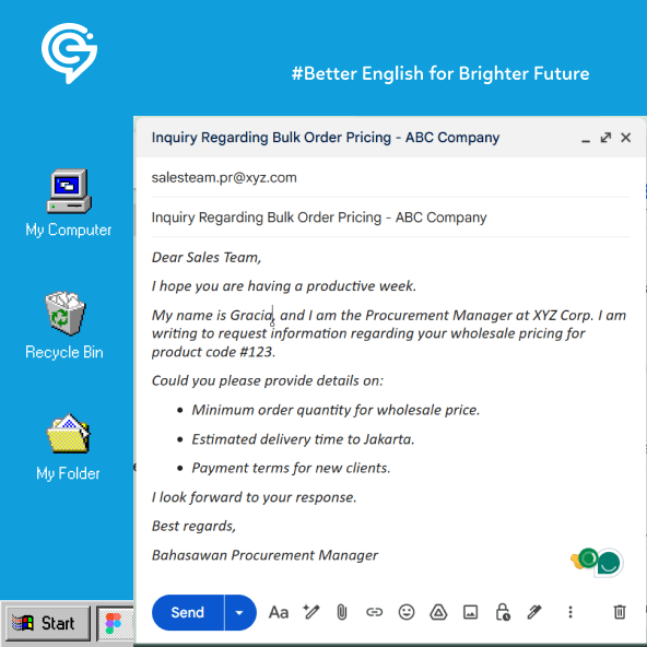 Dalam konteks bisnis, hindari kata-kata yang terlalu santai atau menggunakan bahasa slang. Contoh bedanya: